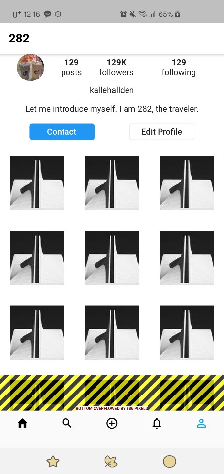 프로필 내용의 아래 부분에 넣은 GridView가 남는 공간만 차지했으면 좋겠는데, 계속 내용물의 크기만큼 그려지려고 해서 Bottom overflowed By 886 Pixels 라는 에러가 보였다. 어제 저녁 내내 고민하다가 Android Studio에서 다음과 같은 에러 사유를 발견했다.