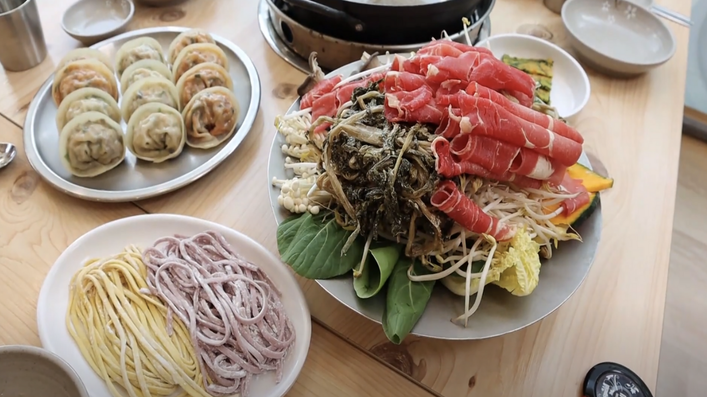 양념 시래기+샤브 소고기(100g)+7가지 샤브 채소+수제 손만두(김치만두 4개, 고기만두 4개)+직접 뽑은 칼국수(단호박, 자색고구마)+배추 겉절이+깍두기+샤브 소스