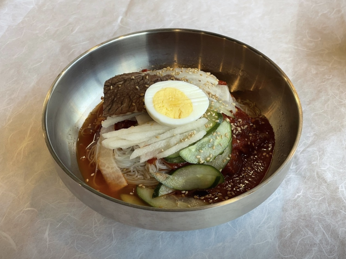 직접 뽑은 면+살얼음 육수+특제 양념장+절인 오이+절인 무+계란+배